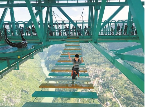 小朋友在体验花江峡谷大桥“步步惊心”项目。左超文 摄